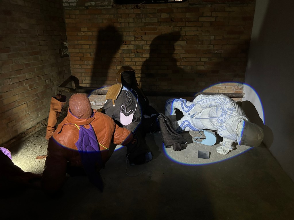 The work explores the duality between outward communication and inner care. Composed of three anthropomorphic figures—“omini”—draped in garments made from found and discarded materials, the installation reflects both a desire to connect with others and a need to preserve one’s own sense of identity with intimacy and affection.